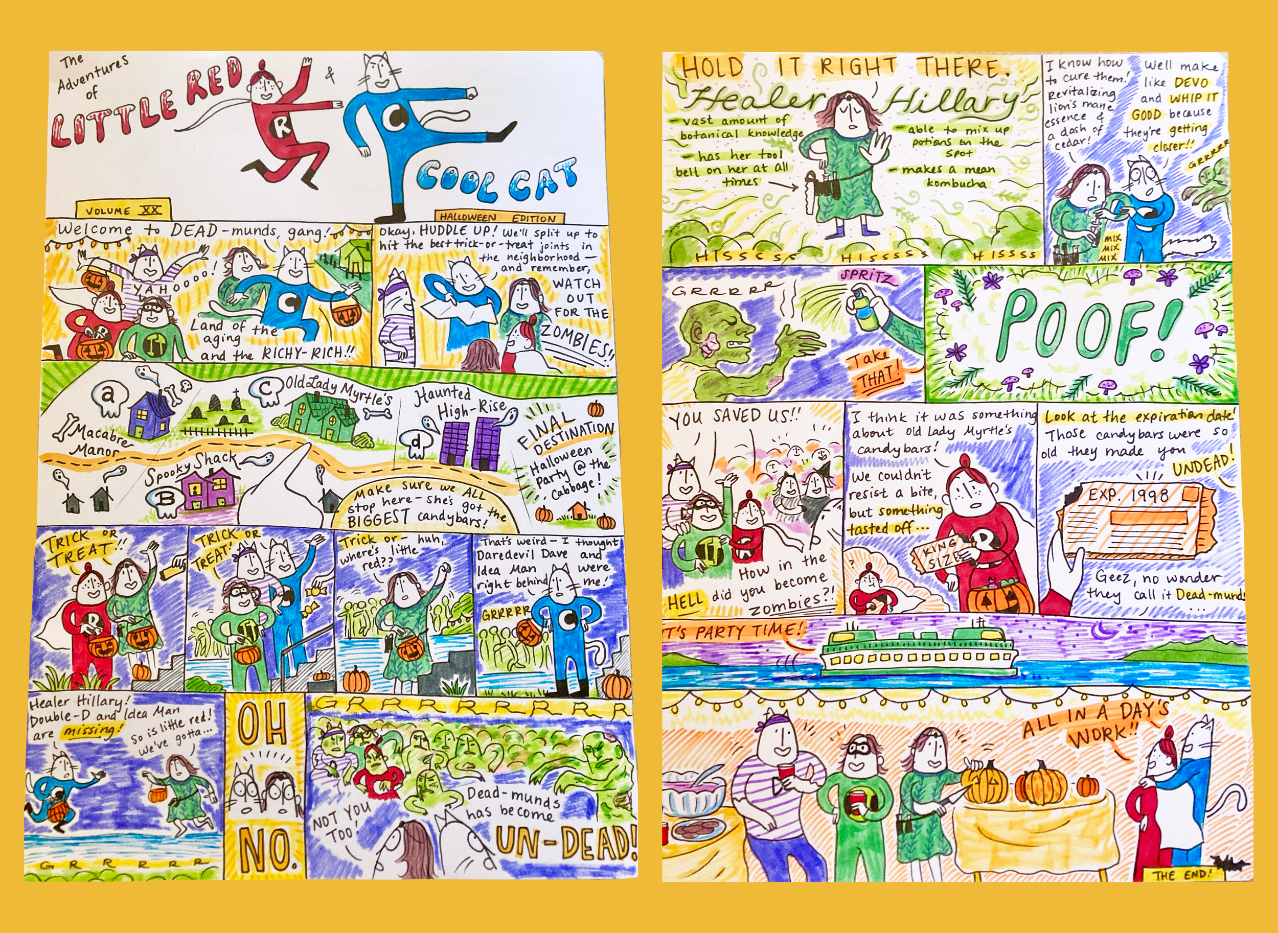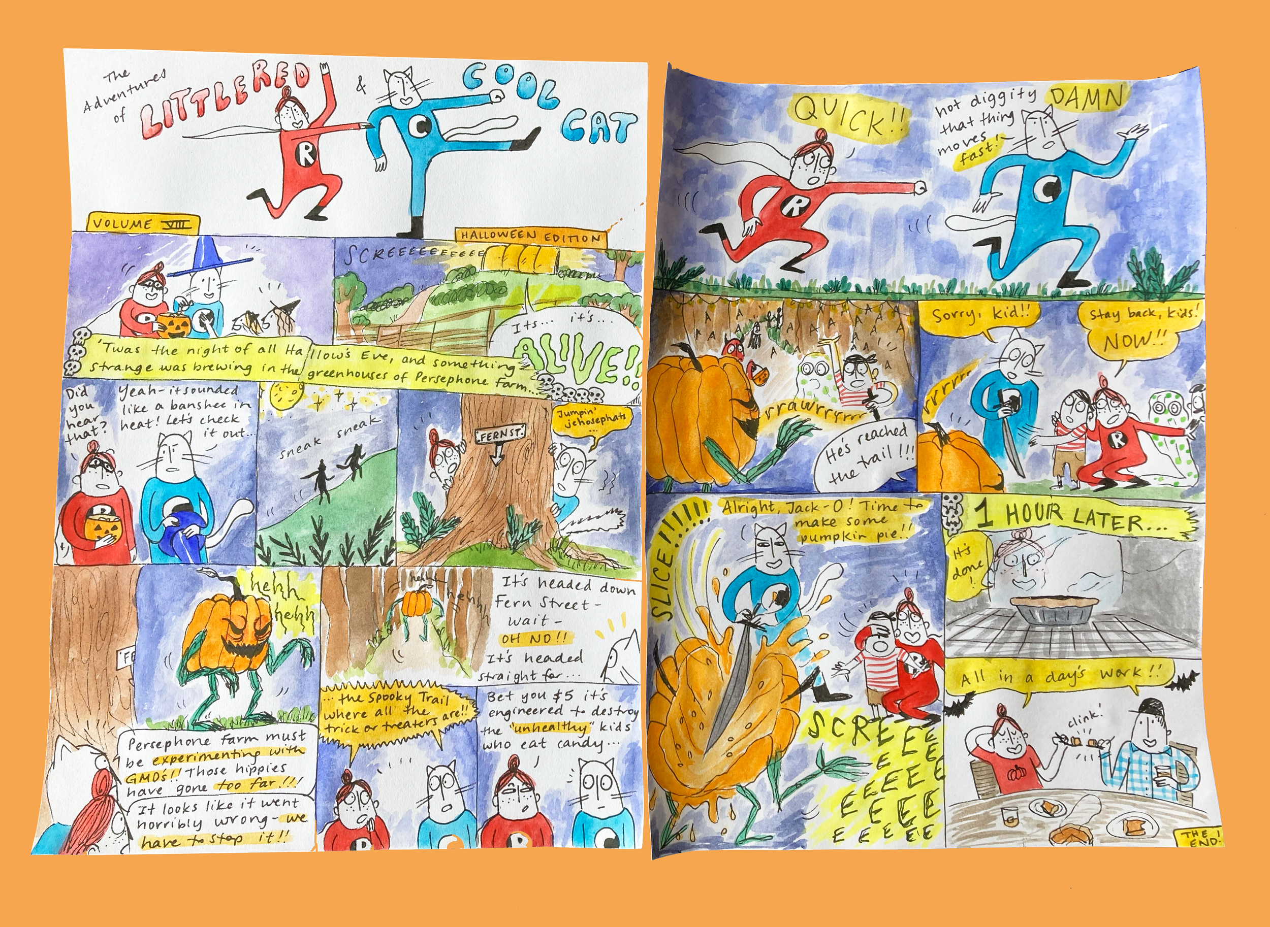 This is my longest-running personal comic project! Three times a year, I make my dad a comic of us as superheroes. It plays on our shared memories, inside jokes, and all kinds of imagined shenanigans.